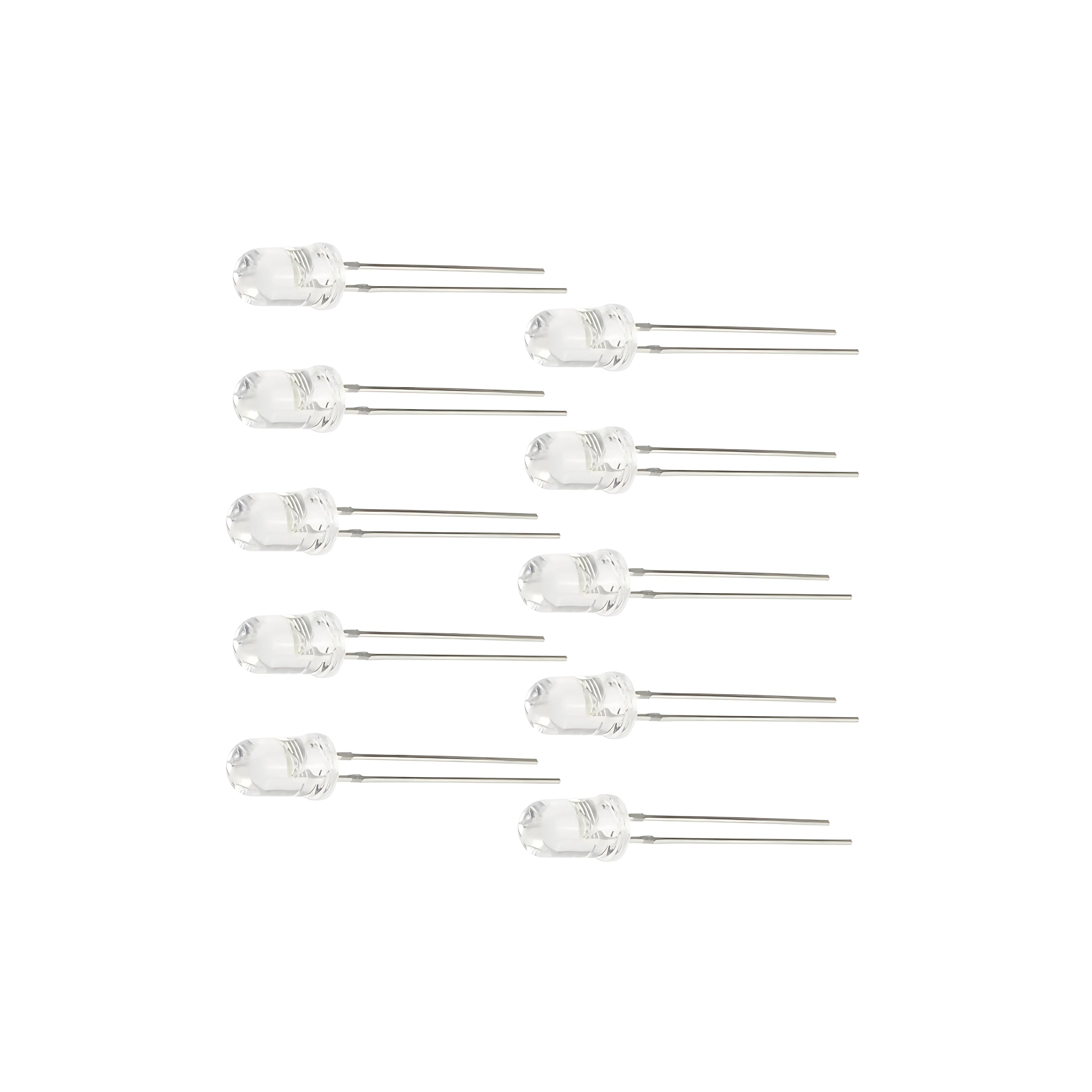 Description: This pack contains ten (10) high-quality 5mm White LED (Light Emitting Diode) lights, perfect for adding specific visual indicators...