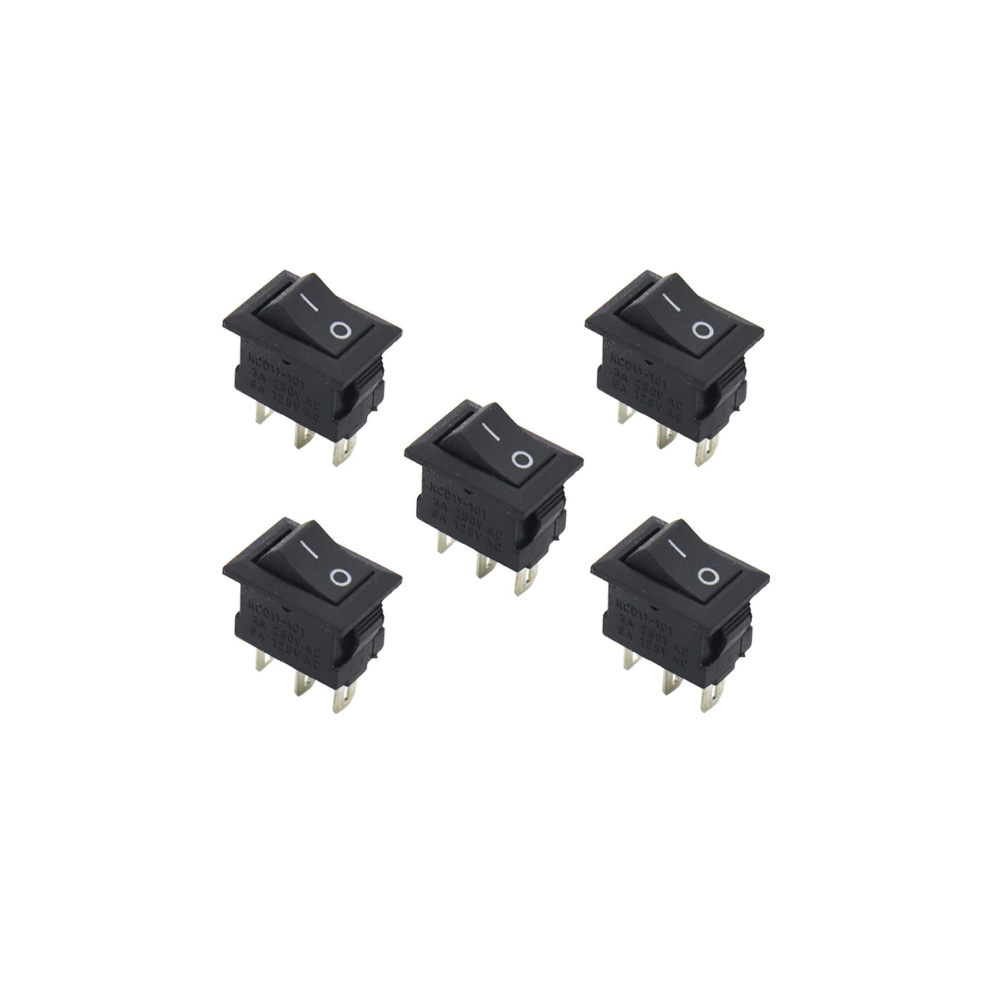 This is a set of 5 KCD11 mini rocker switches, featuring a simple on-off function with a 3-pin configuration. The compact size makes them ideal for a wide range of small-scale electronics projects, hobbyist applications, and DIY circuit boards. Each switch is designed for a secure panel-mount installation.