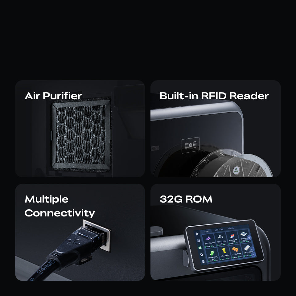 - Automation Features: Filament paste cutter, auto belt tension, RFID recognition, 32 GB eMMC storage