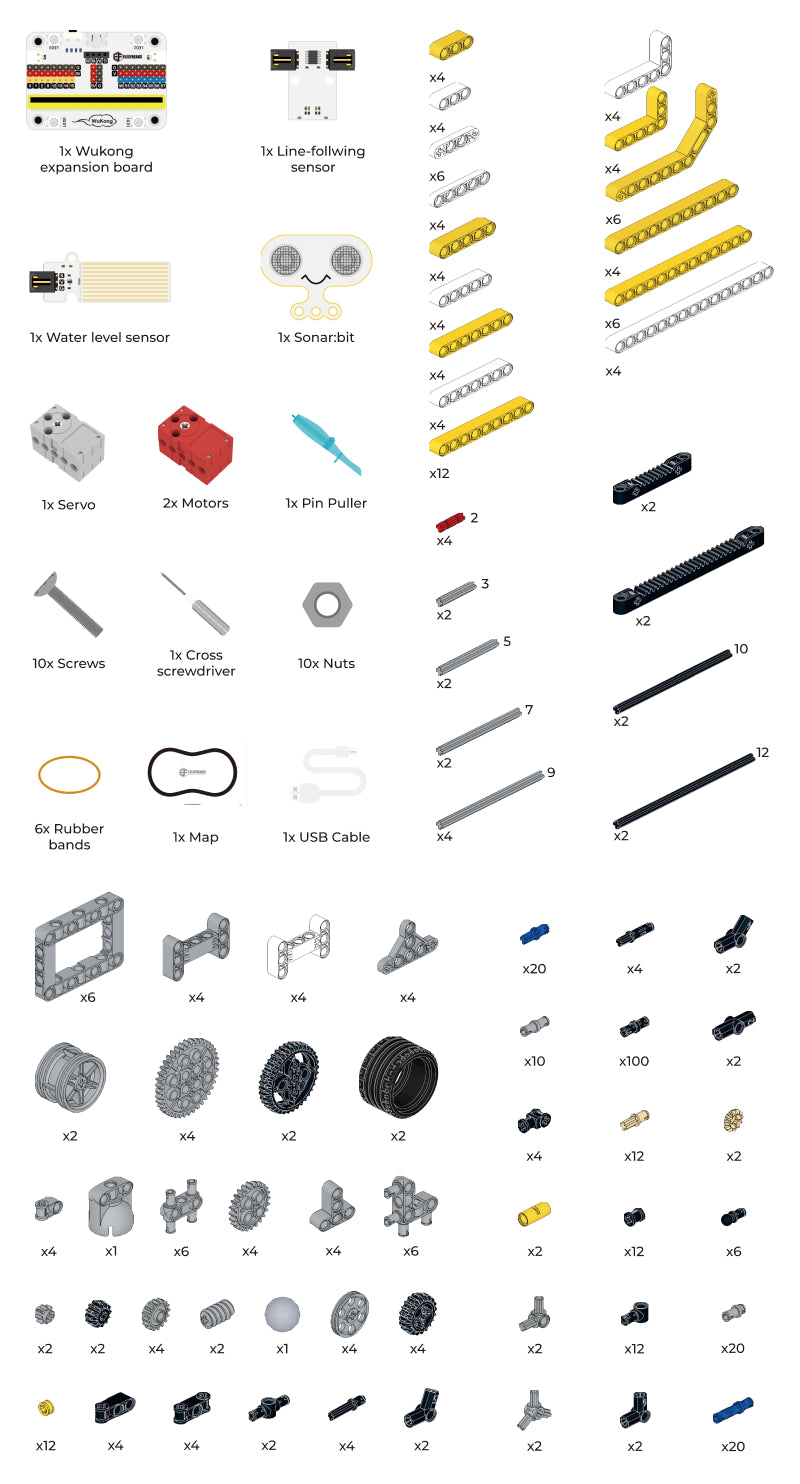 The ELECFREAKS micro:bit 32 in 1 Wonder Building Kit (without micro:bit board) focuses on expanding the blocks with 32 projects available on the WIKI, giving you more options to create more projects. It is equipped with various electronic sensors such as a line tracking sensor, Sonar:bit, water level sensor, etc., to add more challenge and fun to your projects.